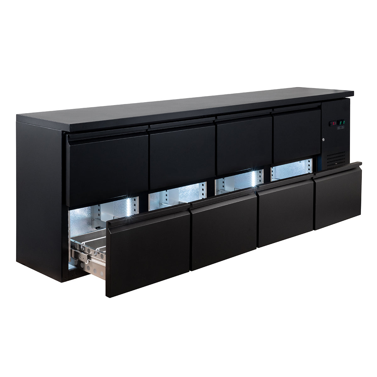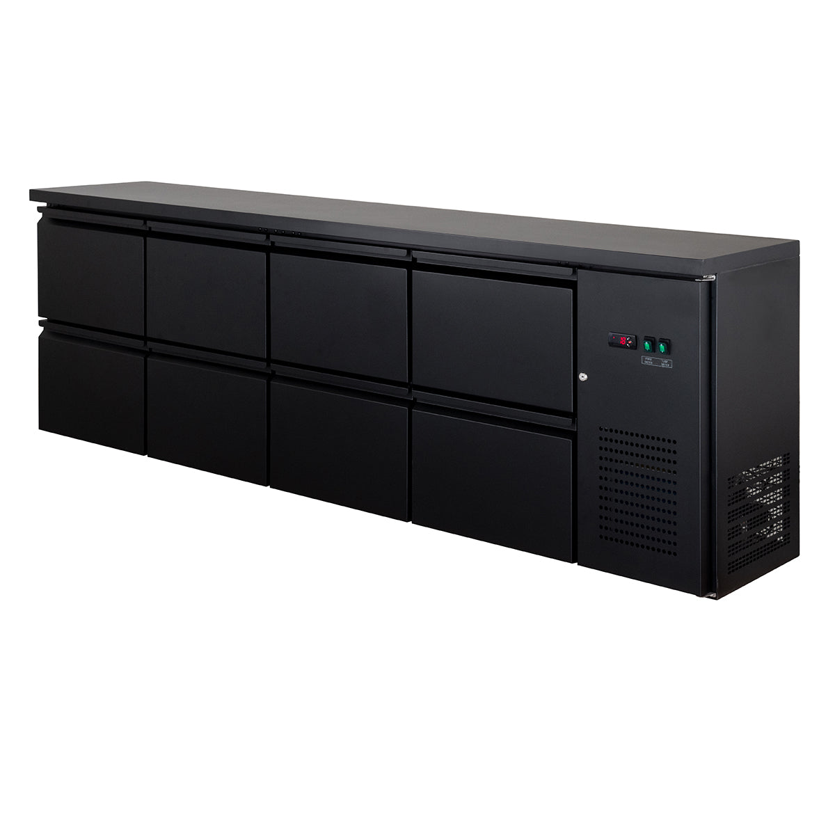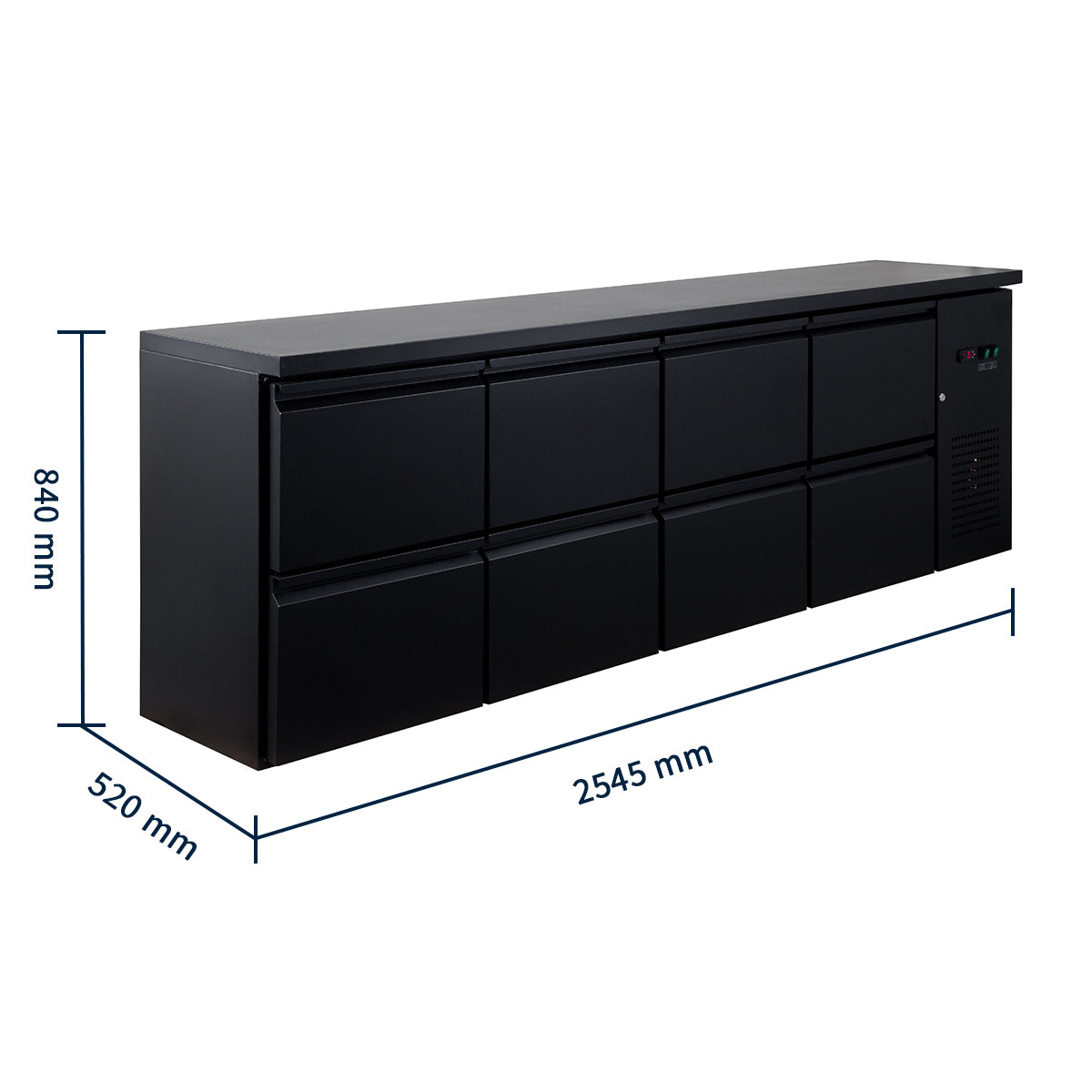 Nos tables réfrigérées pour bars de la série ECO impressionnent par leur design moderne et leur haute fonctionnalité. Grâce à la plage de température idéale de +2°C à +8°C, vous pouvez conserver vos boissons de manière optimale. Grâce à leur profondeur totale de 520 mm et à leur hauteur totale de 840 mm, les tables de refroidissement des barres sont également particulièrement peu encombrantes - ceci est particulièrement important dans les zones de barres souvent étroites.