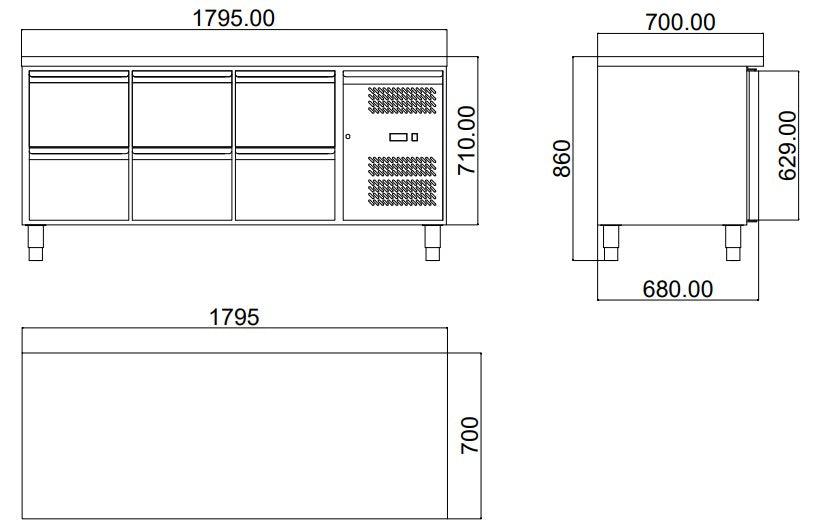 • Plan de travail, intérieur, tiroirs et panneaux latéraux en acier inoxydable de haute qualité
