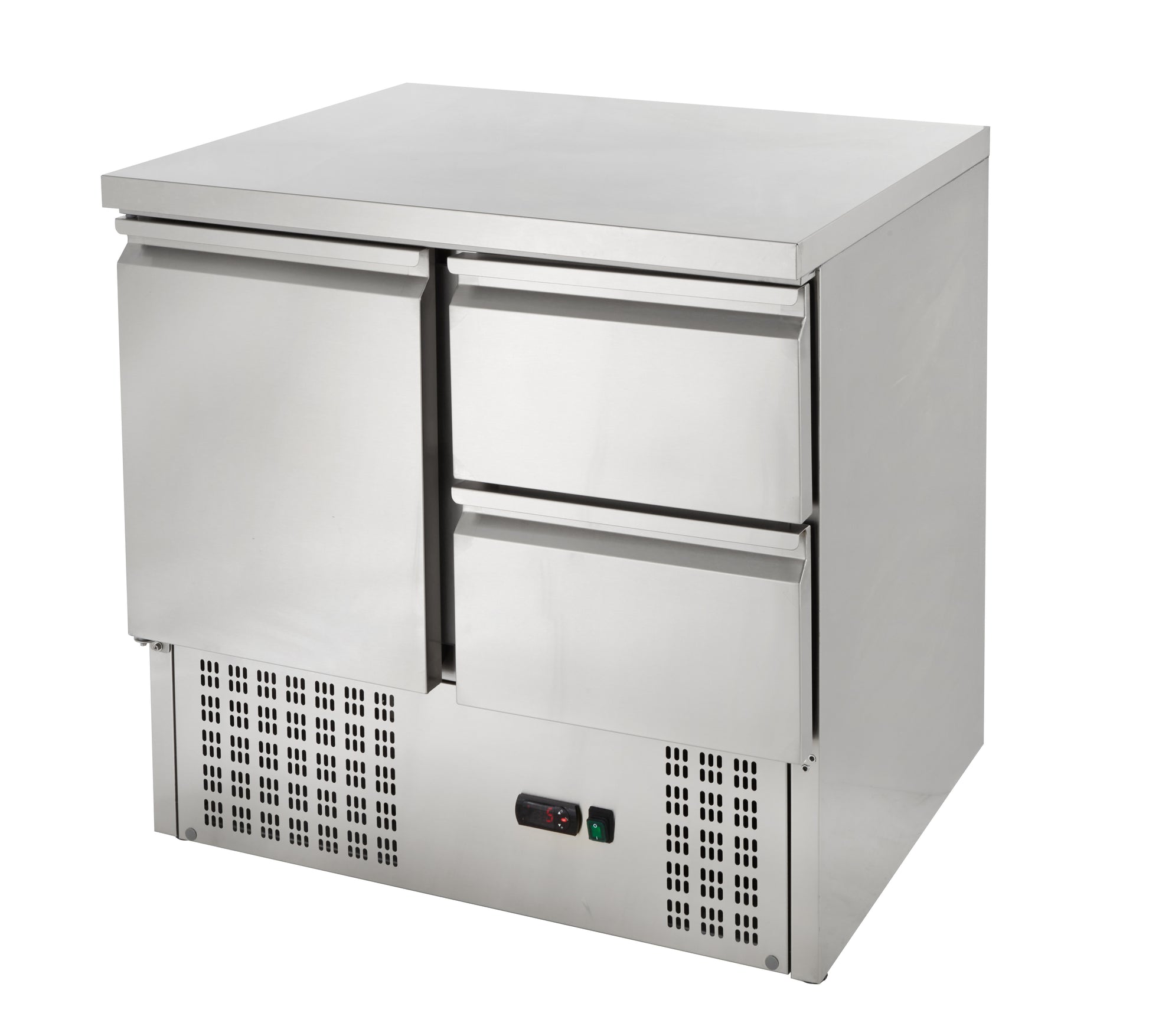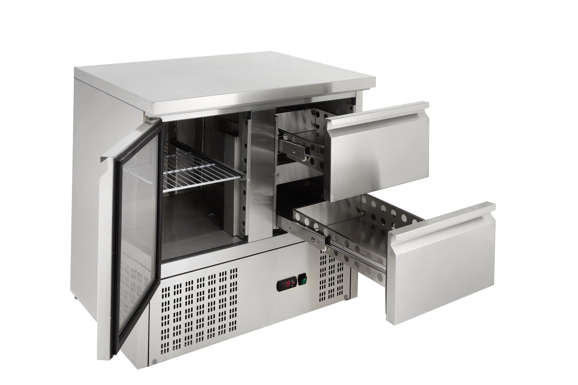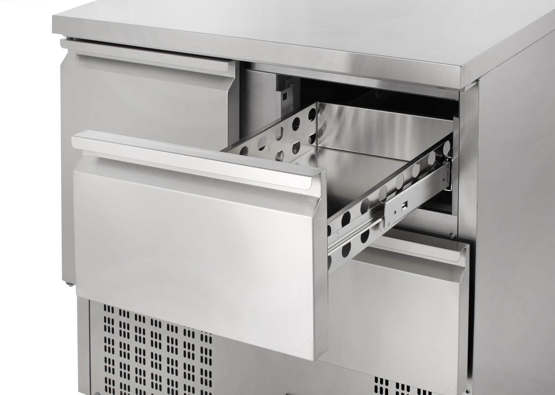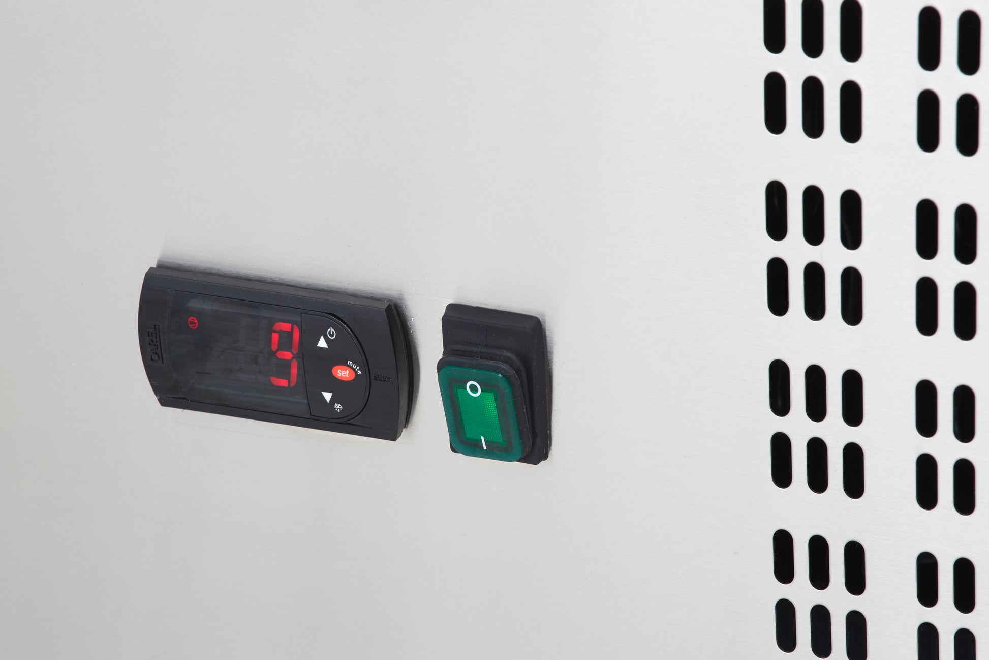 Nos tables réfrigérantes de la série ECO impressionnent par un design moderne, une fonctionnalité élevée et une construction particulièrement robuste. Grâce à l'idéal La plage de température de +2°C à +8°C vous permet de conserver vos aliments au frais de manière optimale. Le thermostat électronique avec affichage LED vous facilite l'utilisation et garantit en même temps une température de refroidissement individuelle et précise.
