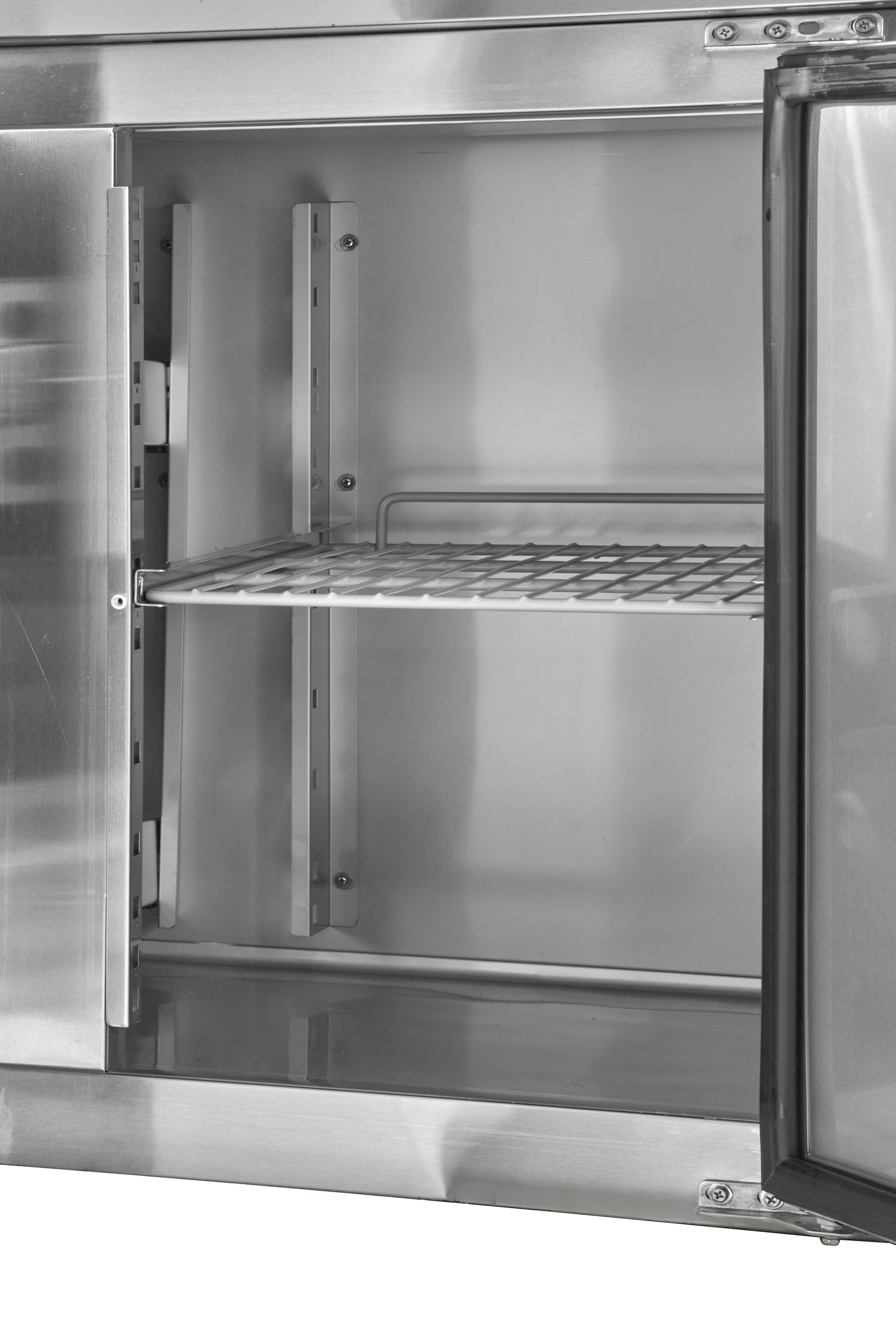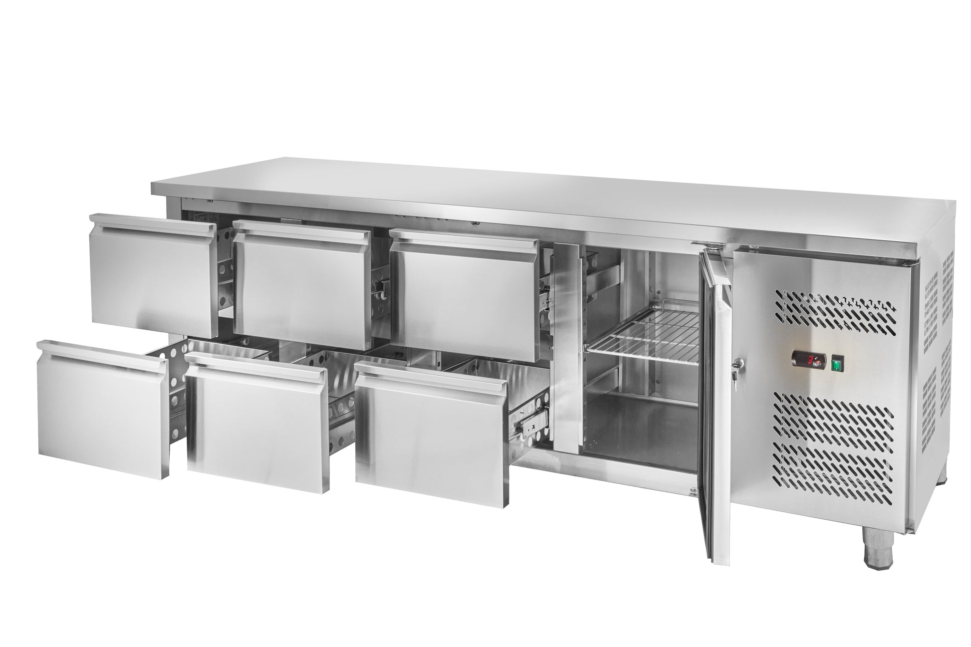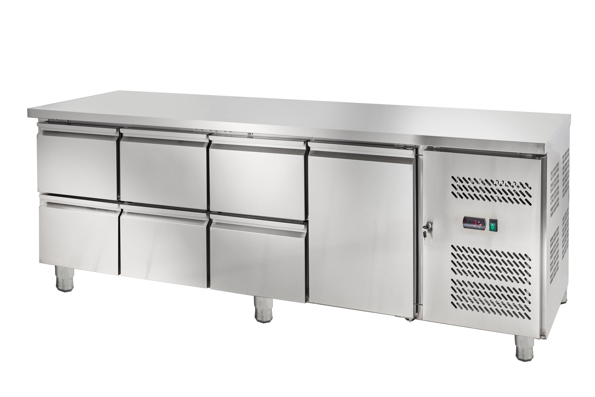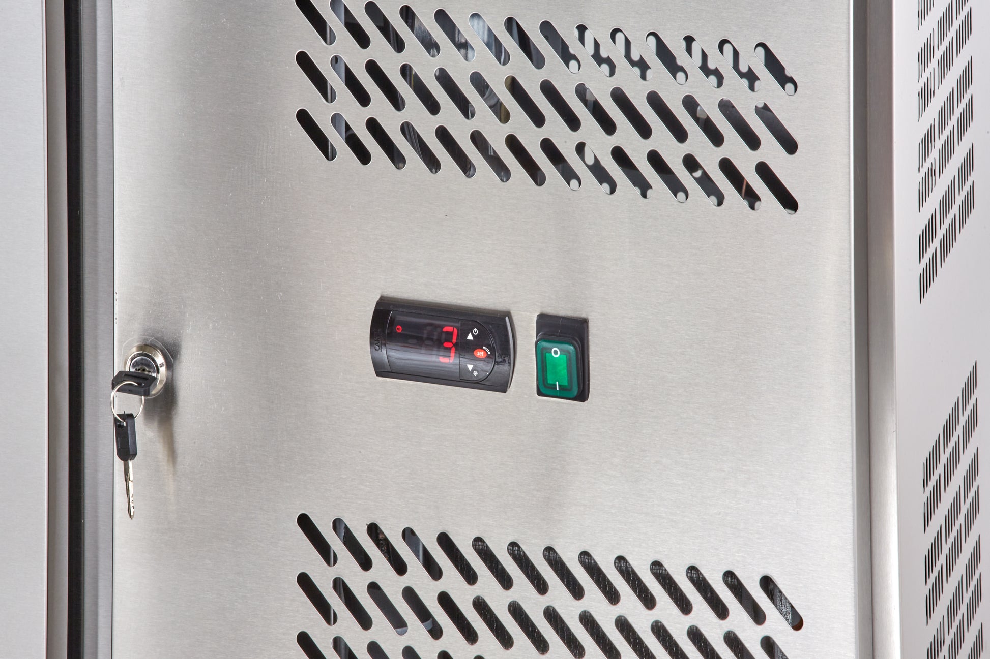 Nos tables réfrigérantes de la série ECO impressionnent par un design moderne, une fonctionnalité élevée et une construction particulièrement robuste. Grâce à l'idéal La plage de température de -2°C à +8°C vous permet de conserver vos aliments au frais de manière optimale. Le thermostat électronique avec affichage LED vous facilite l'utilisation et garantit en même temps une température de refroidissement individuelle et précise.