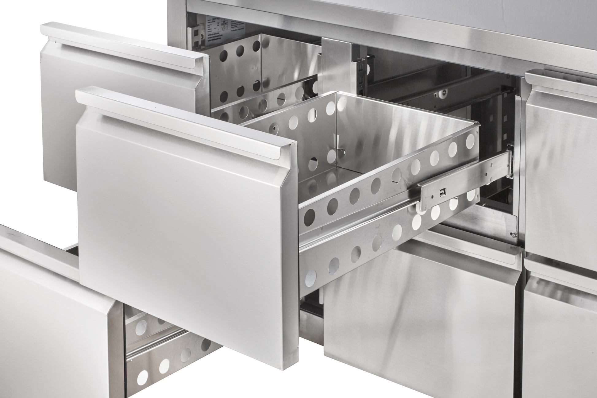 • Plan de travail, intérieur, porte, tiroirs et panneaux latéraux en acier inoxydable de haute qualité