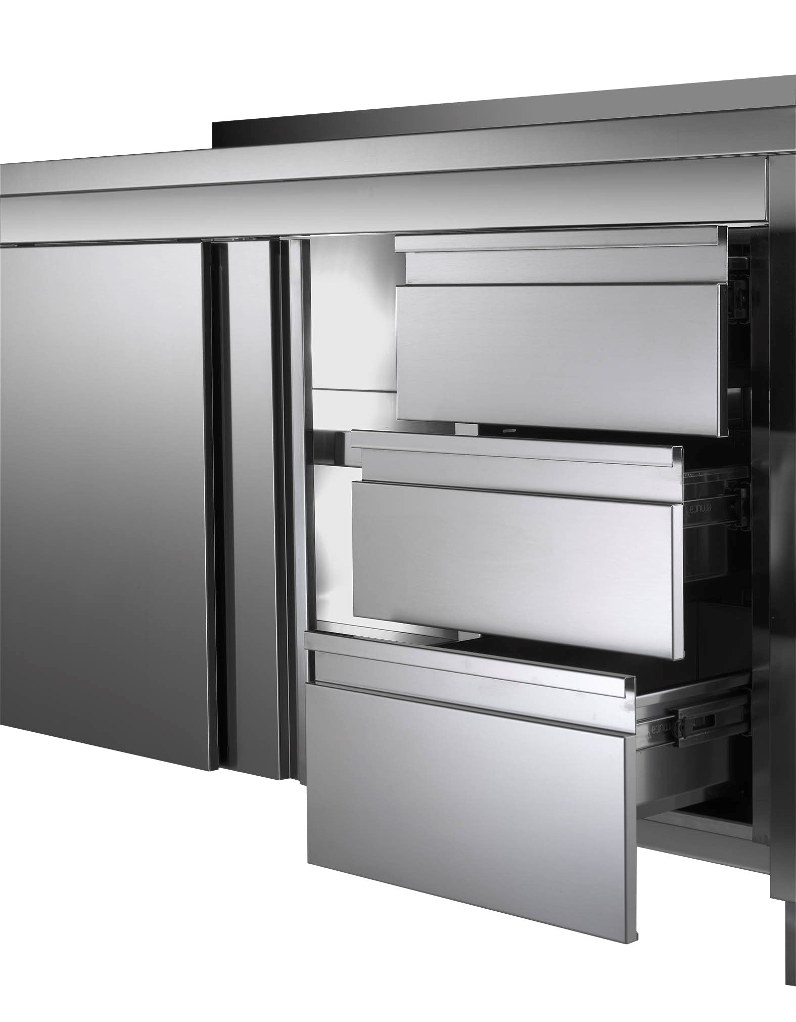 Edelstahl-Arbeitsschrank ECO mit Schiebetür und 3 Schubladen 16x7 mit Aufkantung