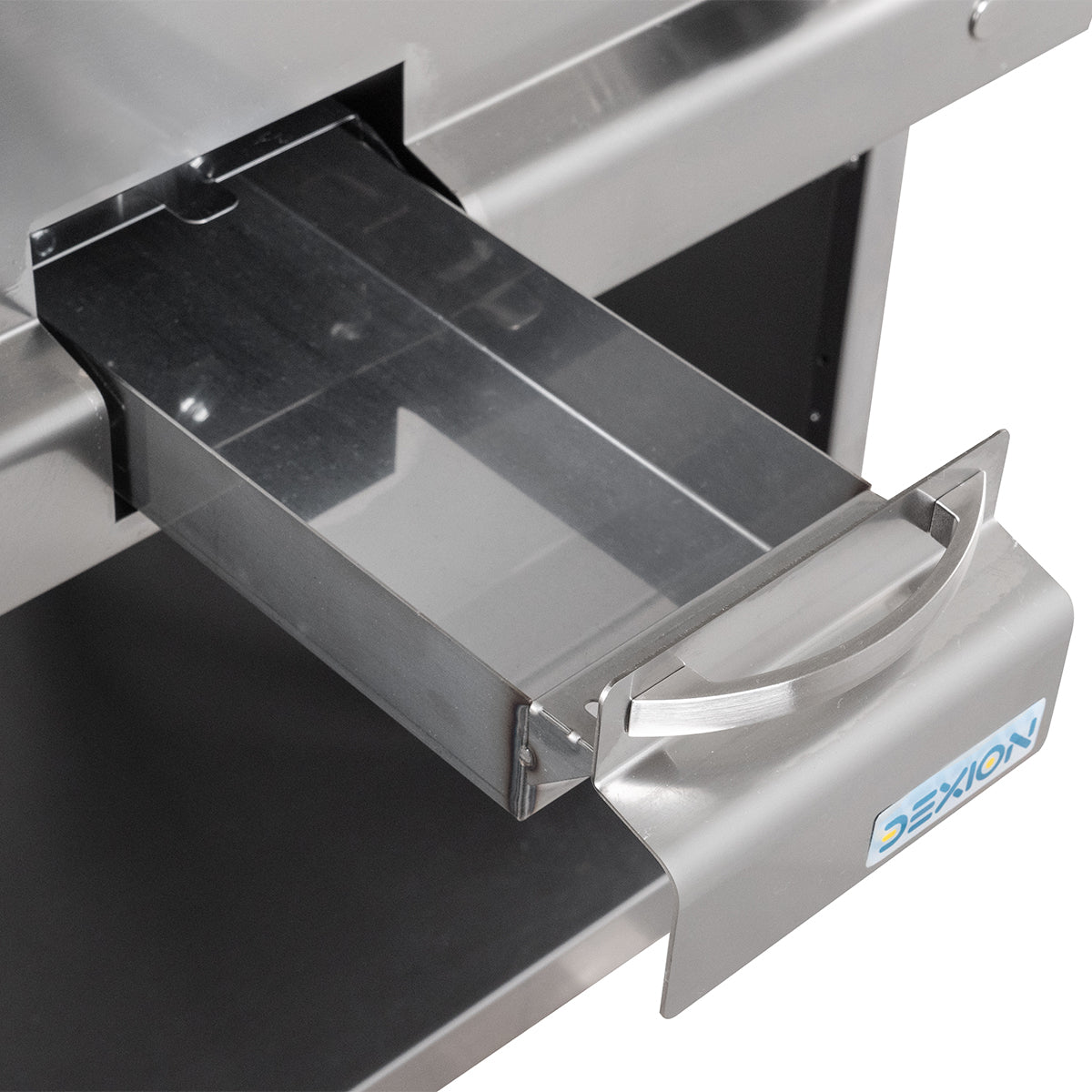 • Eine herausnehmbare Fettschublade ist direkt unter der Grillplatte platziert und fasst 2 Liter