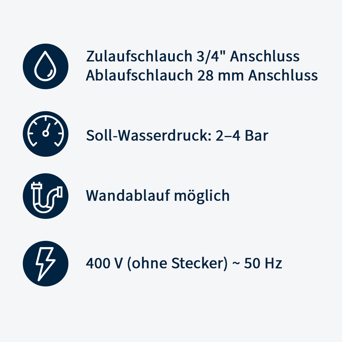 - Wasserverbrauch: ~ 2,7 Liter / Spülgang bei einem Wasserdruck von 2 Bar