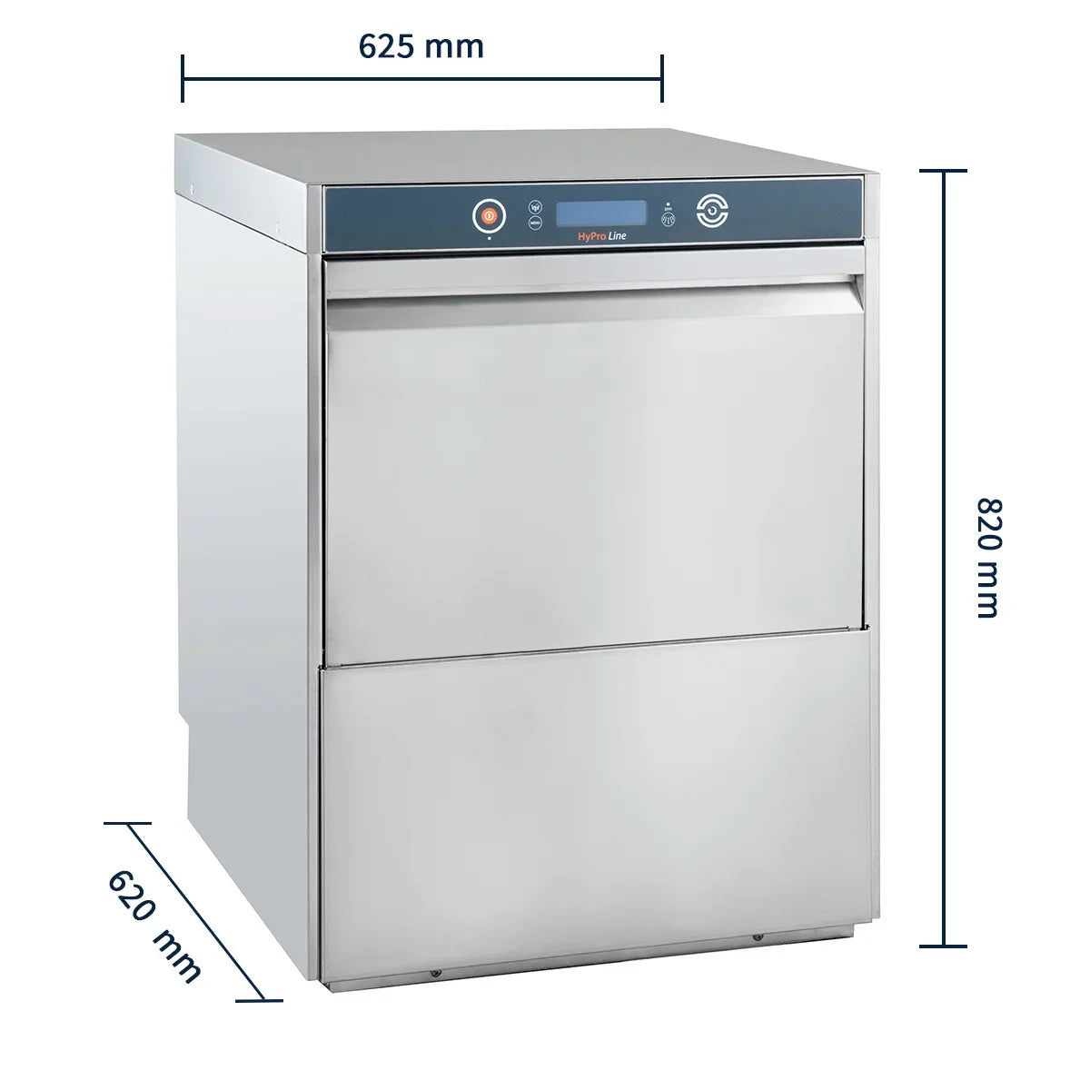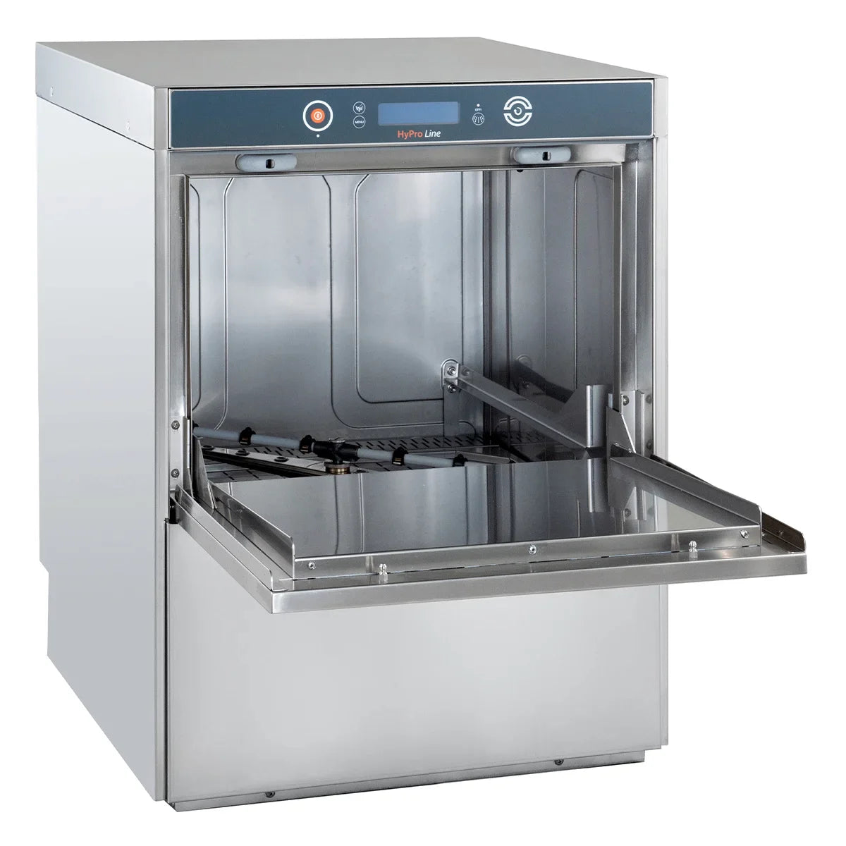 Über das Klartextdisplay der Geschirrspülmaschine HyPro 54 SLE können die unterschiedlichen Programme anwenderfreundlich ausgewählt und nach persönlichen Bedürfnissen angepasst werden. Die eingebaute Drucksteigerungspumpe schafft mehr Unabhängigkeit vom gegebenen Wasserdruck und ermöglicht zusätzlich die Einhaltung höherer Hygienestandards. Elektronische Dosierpumpen bieten die Möglichkeit eine sehr genaue und sparsame Dosierung unserer Reinigungschemie und erreichen gemeinsam mit der Drucksteigerungspumpe ein hygienisches Spülergebnis. Unsere HyPro Untertischspülmaschinen werden allen Bedürfnissen eines modernen und professionellen Gewerbes in der Gastronomie, der Hotellerie, in Cafés oder anderen Betrieben, gerecht.