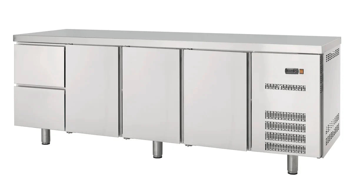 Unsere Kühltische aus der PROFI-Serie überzeugen mit modernem Design, hoher Funktionalität, Langlebigkeit sowie einer hochwertigen Verarbeitung. Dank des idealen Temperaturbereichs von -2°C bis +8°C können Sie Ihre Lebensmittel optimal gekühlt lagern. Das hier verwendete Temperatur-Messsystem vemeidet zu häufiges Anspringen des Aggregats und arbeitet daher besonders energiesparsam und umweltschonend. Sobald die Produkte im Inneren die gewünschte Temperatur erreicht haben, sinkt der Energieverbrauch beträchtlich. Unsere PROFI-Kühltische bieten eine perfekte Mischung zwischen Arbeitsfläche und Lagerfläche.