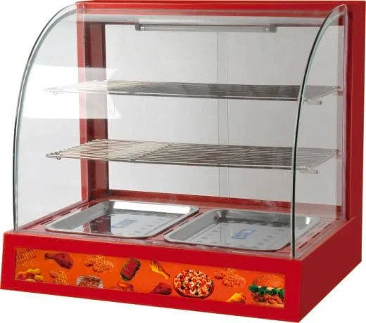 Der Snackwärmer bietet ihnen eine optimale Präsentationsfläche für ihre warmen Speisen an. Mit den zwei gut beleuchteten Ablageflächen und der zusätzlichen Fläche am Boden, werden ihre Produkte appetitlich angeleuchtet und dem Kunden atttraktiv präsentiert. Das gerundete Glas ermöglicht einen Rundumblick auf die Warenauslage.